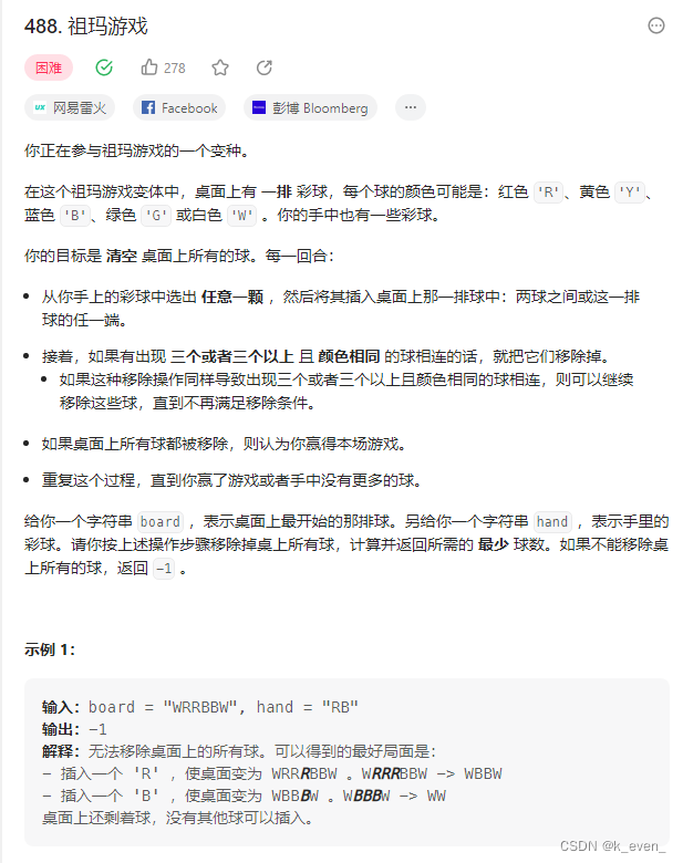 class Solution {class Node {String b;int[] colorNumber;int cur; // 当前代价int eva; // 预期代价Node(String b, int[] colorNumber, int cur, int eva) {this.b = b;this.colorNumber = colorNumber.clone();this.cur = cur;this.eva = eva;}}// 消除当前Board上所有彩球,最少需要的代价public int evaluate(String b, int[] colorNumber) {int[] bx = new int[5];for (int i = 0; i < b.length(); i++) {bx[cn.get(b.charAt(i))]++;}int count=0;for (int i = 0; i < 5; i++) {if(bx[i]>0 && bx[i]<3) {if(colorNumber[i] + bx[i] < 3) {return -1; // 不可行} else {count += 3-bx[i];}}}return count;}HashMap cn; // RYBGW 01234public int findMinStep(String board, String hand) {// 升序PriorityQueue q = new PriorityQueue<>((a, b)->(a.cur+a.eva)-(b.cur+b.eva));int n = hand.length(); // 球的总数int[] colorNumber = new int[5]; // 五种颜色的球的数量char[] color = new char[]{'R','Y','B','G','W'};cn = new HashMap<>();for (int i = 0; i < 5; i++) {cn.put(color[i],i);}for (int i = 0; i < hand.length(); i++) {colorNumber[cn.get(hand.charAt(i))]++;}q.add(new Node(board, colorNumber,0,evaluate(board,colorNumber)));HashMap map = new HashMap<>(); // 已有的状态map.put(merge(board,colorNumber),0);while (!q.isEmpty()) {Node node = q.poll();char[] b = node.b.toCharArray();int len = b.length; // 桌面上球剩余数量int cur = node.cur+1;int[] h = node.colorNumber;for (int i = 0; i < 5; i++) {char c = color[i];if(h[i] <= 0) {continue;}int[] hnew = h.clone(); hnew[i]--;int k=0;while (k= 0) {String state=merge(bnew,hnew);if(!map.containsKey(state) || map.get(state) > cur) {q.add(new Node(bnew,hnew,cur,eva));map.put(state,cur);}}while (k 2) {board = eliminate(board,k,k);}return board;}// 消除public String eliminate(String board, int i, int j) {int n = board.length();char c = board.charAt(i);while (i-1>=0 && c == board.charAt(i-1)) {i--;}while (j+11) {board = board.substring(0,i)+board.substring(j+1,n);if(board.length() > 2) {i = i>0?i:1;board = eliminate(board,i-1,i-1);}}return board;}