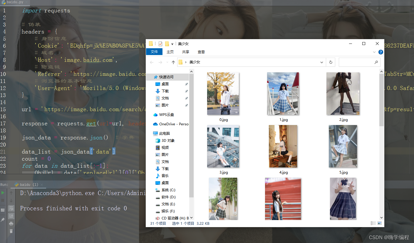 headers = {# 身份信息'Cookie': 'BDqhfp=jk%E5%B0%8F%E5%A7%90%E5%A7%90%26%26NaN-1undefined%26%260%26%261; BIDUPSID=C24C7D8E598E67C686237DEAF51F7B28; PSTM=1656683846; BAIDUID=90512AA3632B152E5F977142A71CD0B0:SL=0:NR=10:FG=1; newlogin=1; MCITY=-%3A; BDUSS=VBkUnZuOUJjVWJRSzRQVmRrOFNuVlZpOWxXMXI2MmN5eUhmdG94aElsVXJXSWhqSVFBQUFBJCQAAAAAAAAAAAEAAADRI~rzv8nE3MrHybXByzMAAAAAAAAAAAAAAAAAAAAAAAAAAAAAAAAAAAAAAAAAAAAAAAAAAAAAAAAAAAAAAAAAAAAAACvLYGMry2Bje; BDUSS_BFESS=VBkUnZuOUJjVWJRSzRQVmRrOFNuVlZpOWxXMXI2MmN5eUhmdG94aElsVXJXSWhqSVFBQUFBJCQAAAAAAAAAAAEAAADRI~rzv8nE3MrHybXByzMAAAAAAAAAAAAAAAAAAAAAAAAAAAAAAAAAAAAAAAAAAAAAAAAAAAAAAAAAAAAAAAAAAAAAACvLYGMry2Bje; BDORZ=B490B5EBF6F3CD402E515D22BCDA1598; indexPageSugList=%5B%22%E4%BB%96%E5%A6%88%E7%9A%84%20%E8%A1%A8%E6%83%85%E5%8C%85%22%2C%22%E6%87%92%20%E8%A1%A8%E6%83%85%E5%8C%85%22%2C%22%E6%88%91%E5%BE%88%E6%87%92%20%E8%A1%A8%E6%83%85%E5%8C%85%22%2C%22%E5%B0%B1%E8%BF%99%E6%A0%B7%E7%BB%93%E6%9D%9F%E4%BA%86%20%E8%A1%A8%E6%83%85%E5%8C%85%22%2C%22%E5%9C%9F%E5%BA%93%E6%9B%BC%E6%96%AF%E5%9D%A6%22%2C%22%E5%9C%9F%E5%BA%93%E6%9B%BC%E6%96%AF%E5%9D%A6%E4%B8%96%E7%95%8C%E5%9C%B0%E5%9B%BE%22%2C%22%E5%9C%9F%E5%BA%93%E6%9B%BC%E6%96%AF%E5%9D%A6%E4%B8%96%E7%95%8C%22%2C%22%E7%82%B9%E4%B8%AA%E8%B5%9E%20%E8%A1%A8%E6%83%85%E5%8C%85%22%5D; BA_HECTOR=240000240g8g058k2l848qet1hn93qn1f; ZFY=:AUZ:AsSR27Ydrc2egIjwyfTn:BiQthXJLEzDLR4IgwdOQ:C; BAIDUID_BFESS=90512AA3632B152E5F977142A71CD0B0:SL=0:NR=10:FG=1; BDRCVFR[feWj1Vr5u3D]=I67x6TjHwwYf0; delPer=0; BDRCVFR[C0p6oIjvx-c]=ddONZc2bo5mfAF9pywdpAqVuNqsus; BDRCVFR[fb3VbsUruOn]=_M5urk4djP3fA4-ILn; H_PS_PSSID=36545_37771_37778_37724_36802_37662_37538_37672_37741_26350_37786; BDRCVFR[dG2JNJb_ajR]=mk3SLVN4HKm; BDRCVFR[-pGxjrCMryR]=mk3SLVN4HKm; BDRCVFR[Txj84yDU4nc]=mk3SLVN4HKm; BDRCVFR[tox4WRQ4-Km]=mk3SLVN4HKm; BDRCVFR[X_XKQks0S63]=mk3SLVN4HKm; firstShowTip=1; PSINO=7; userFrom=www.baidu.com; ab_sr=1.0.1_ZDc4MzMwNmRiYmU4MjdiMDYyMGJlNjgzMzc0ZDU5OWRmMzg3OTk1NDY3ZjUzZGY3YWY0NGIzMzVhNzYyYzRlNzkzODc2ZmQxNDU5ZmIwZWFhNjQwYmE1MzVkMTY2YTI1YTRhNWYxOTY5MzE2YThkODJiNjQxNDk0MDYxMzBmNmNjOWMxMWUwOTI5MGUyZWU3ZmU1YjJhZjljN2ZlNzkyMg==',# 域名'Host': 'image.***',# 防盗链'Referer': '***search/index?tn=baiduimage&ps=1&ct=201326592&lm=-1&cl=2&nc=1&ie=utf-8&dyTabStr=MCwzLDIsNSwxLDcsNCw2LDgsOQ%3D%3D&word=jk%E5%B0%8F%E5%A7%90%E5%A7%90',# 浏览器的基本信息'User-Agent': 'Mozilla/5.0 (Windows NT 10.0; Win64; x64) AppleWebKit/537.36 (KHTML, like Gecko) Chrome/107.0.0.0 Safari/537.36'