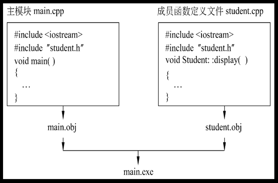类的使用文件( main() 所在的.cpp文件 ) :将类的使用部分(通常是主程序)放在类使用文件中, 这样可以清晰地表示出本程序所要完成的工作。