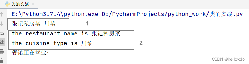 class Restaurant():def __init__(self,r_name,cuisine_type):'''初始化两个属性'''self.r_name=r_nameself.cuisine_type=cuisine_typedef __describe_restaurant__(self):'''将初始化的信息打印出来'''print('the restaurant name is '+self.r_name)print('the cuisine type is '+self.cuisine_type)def __open_restaurant__(self):'''打印餐馆正在营业'''print('餐馆正在营业~')
