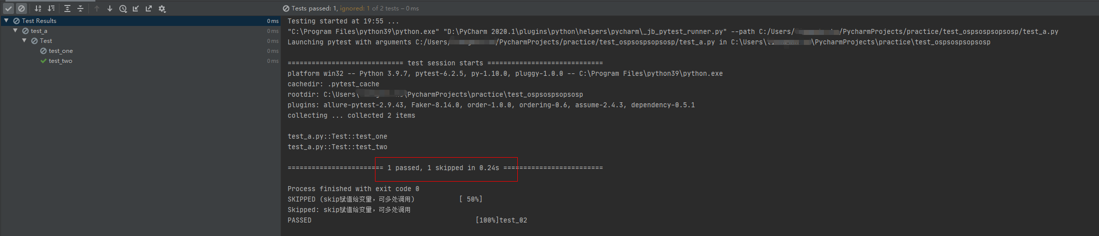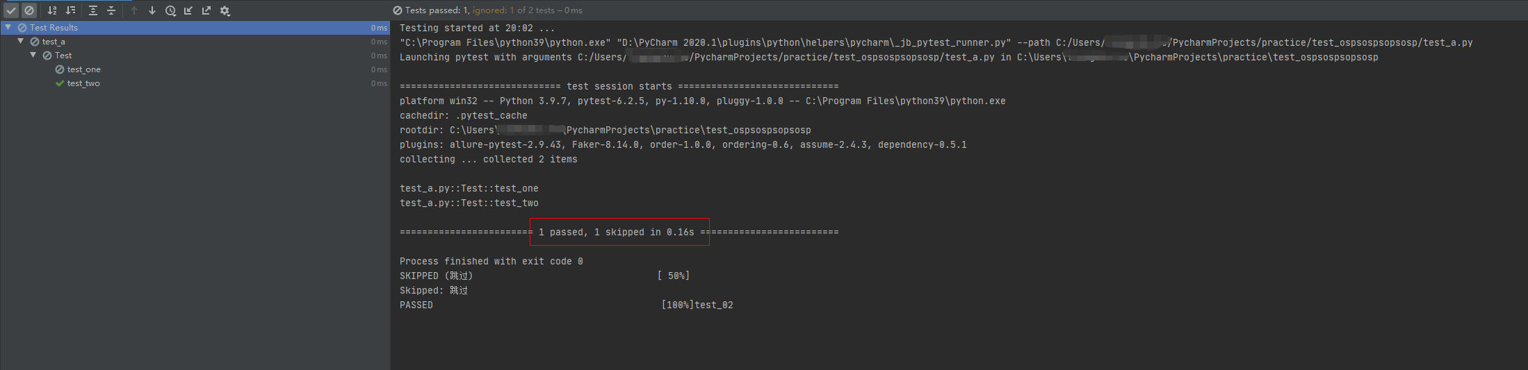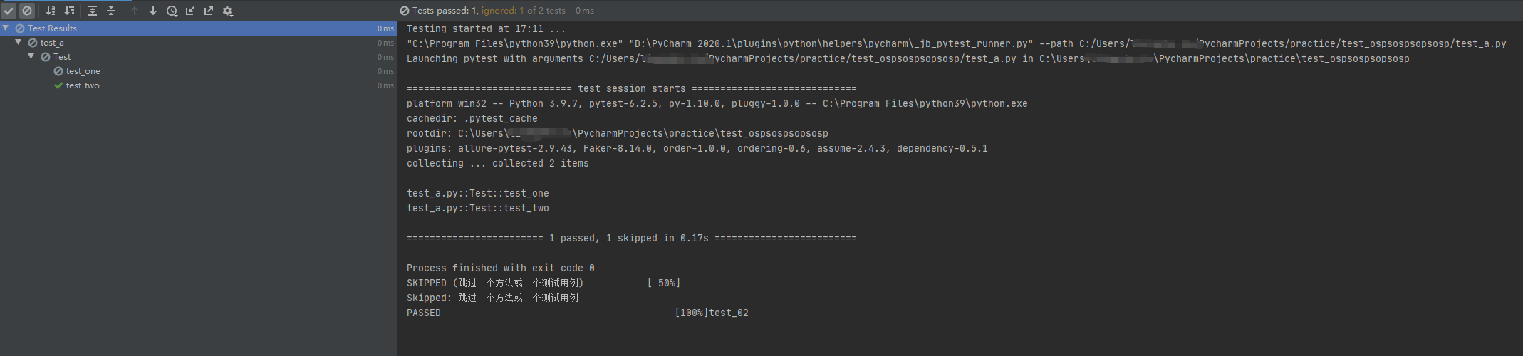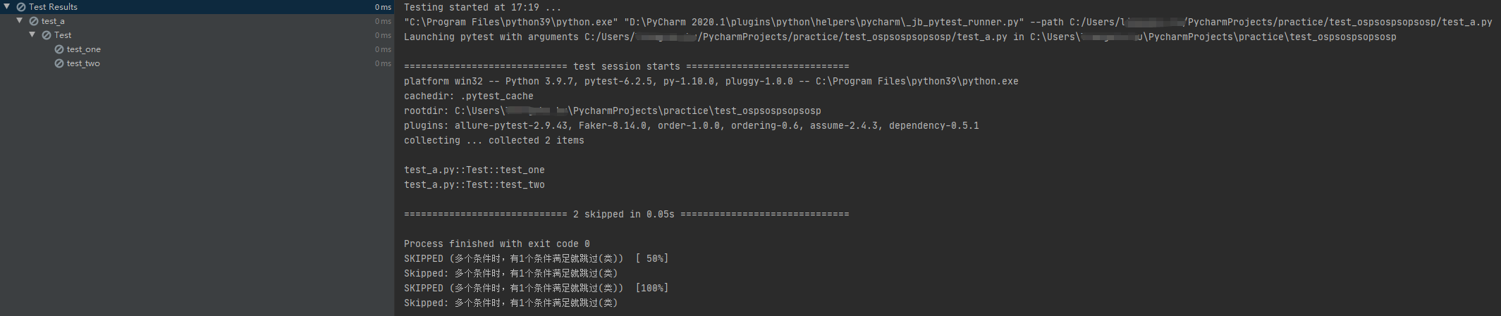import pytestclass Test(object):@pytest.mark.skipif(1 == 1, reason='跳过一个方法或一个测试用例')def test_one(self):assert 1 == 2def test_two(self):print('test_02')assert 1 == 1if __name__ == '__main__':pytest.main(['-rs', 'test01.py'])