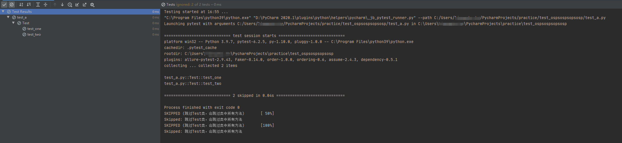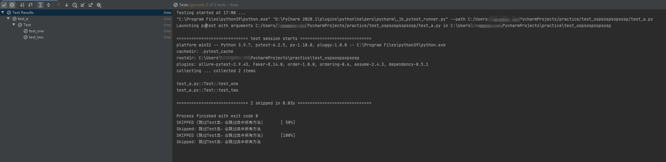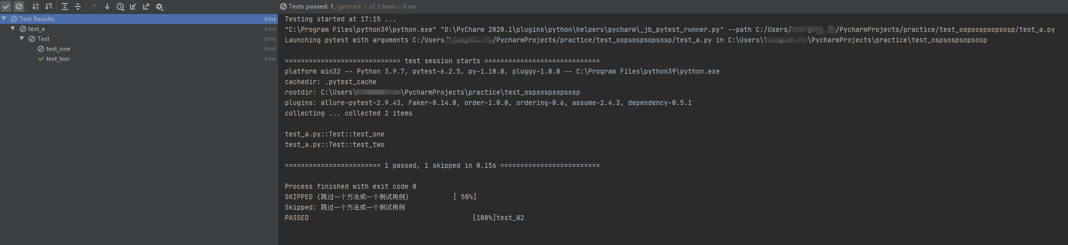 import pytestclass Test(object):@pytest.mark.skipif(1 == 1, reason='跳过一个方法或一个测试用例')def test_one(self):assert 1 == 2def test_two(self):print('test_02')assert 1 == 1if __name__ == '__main__':pytest.main(['-rs', 'test01.py'])