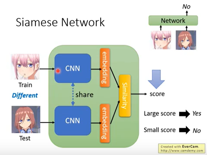 可以用孪生网络实现,孪生网络就是特意设计了网络的架构来完成这件事,用一个general的net work很难实现