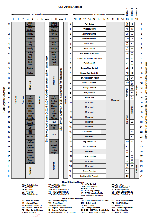 从图中可以看到:SMI device地址从0x00 到0x1d,其中地址0x00到0x0f为PHY寄存器,0x10到0x16为POrt 寄存器,0x1B 为 Global1,0x1C为 Global2,0x1D 为 Global3.