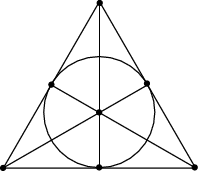 有一种几何方法,可以非常简单地做到这一点。七个号码就是七个点,把它们用直线连起来,每根线上只能有三个点,而每个点出现在三根线上。画成上面的形状,就得到了七根线(内部的圆也算一根线)。然后,记录一下每根线上的号码,很简单就选出了七张彩票。