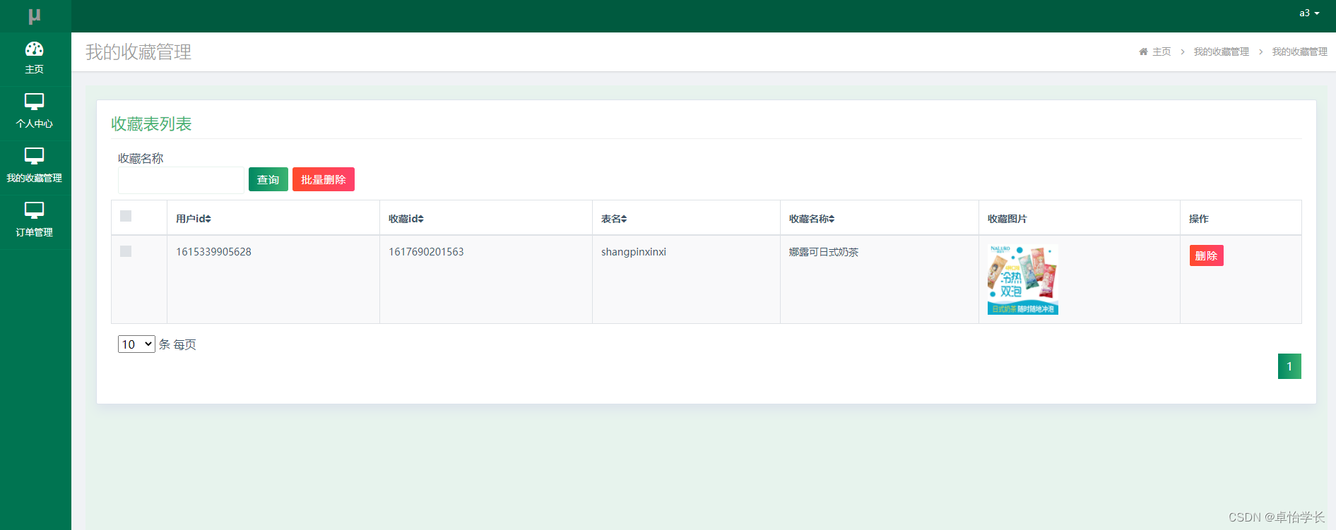 用户点击进入到系统操作界面,可以对主页、个人中心、我的收藏管理、订单管理等功能模块,我的收藏管理:通过列表可以获取用户ID、收藏ID、表名、收藏名称、收藏图片信息并进行修改操作,如图5-1所示。