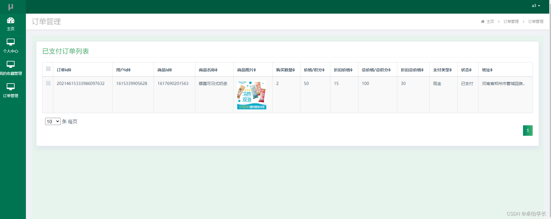 已支付订单列表:管理员通过列表可以获取订单id、用户id、商品id、奶茶名称、商品图片、购买数量、价格/积分、折扣价格、总价格/总积分、折扣总价格、支付类型、