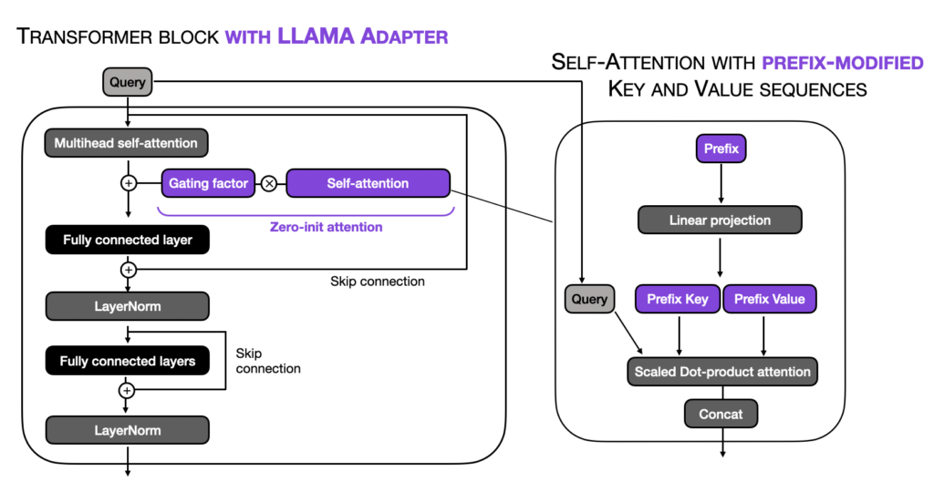 LLaMA-Adapter 方法的主要概念如下图所示,在正常 Transformer 块的修改部分以紫色突出显示: