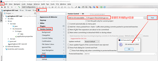 1.在IDEA中设置Git,在File-->Settings->Version Control-->Git-->Path to Git executable选择你的git安装后的git.exe文件,然后点击Test,测试是否设置成功: