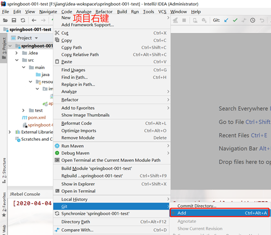 3. 上传项目到本地仓库,项目右键选择Git-->add,此时项目文件变成绿色,此时文件只是处于暂存区,并没有真正进入到版本库中: