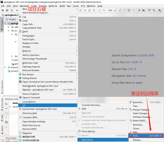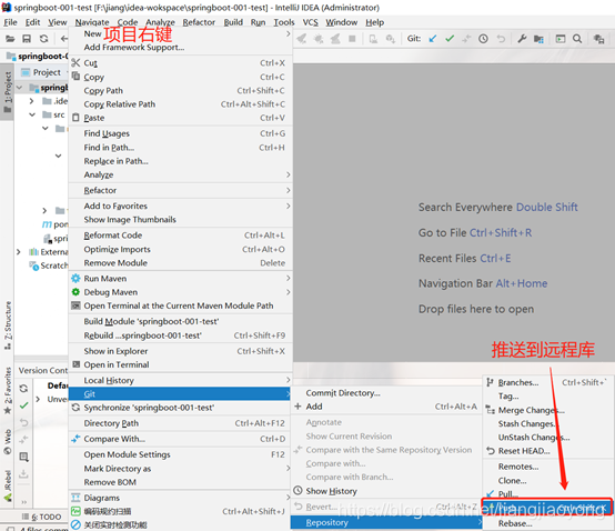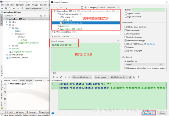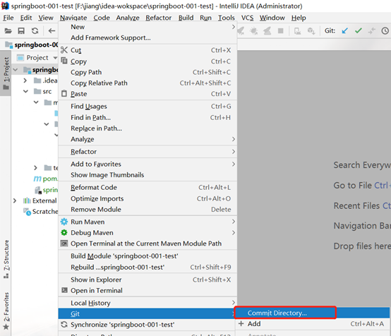 4. 右击工程文件 ->git->commit,提交到本地git。至此,本地git已commit完毕,此时项目文件从暂存区真正进入版本库中: