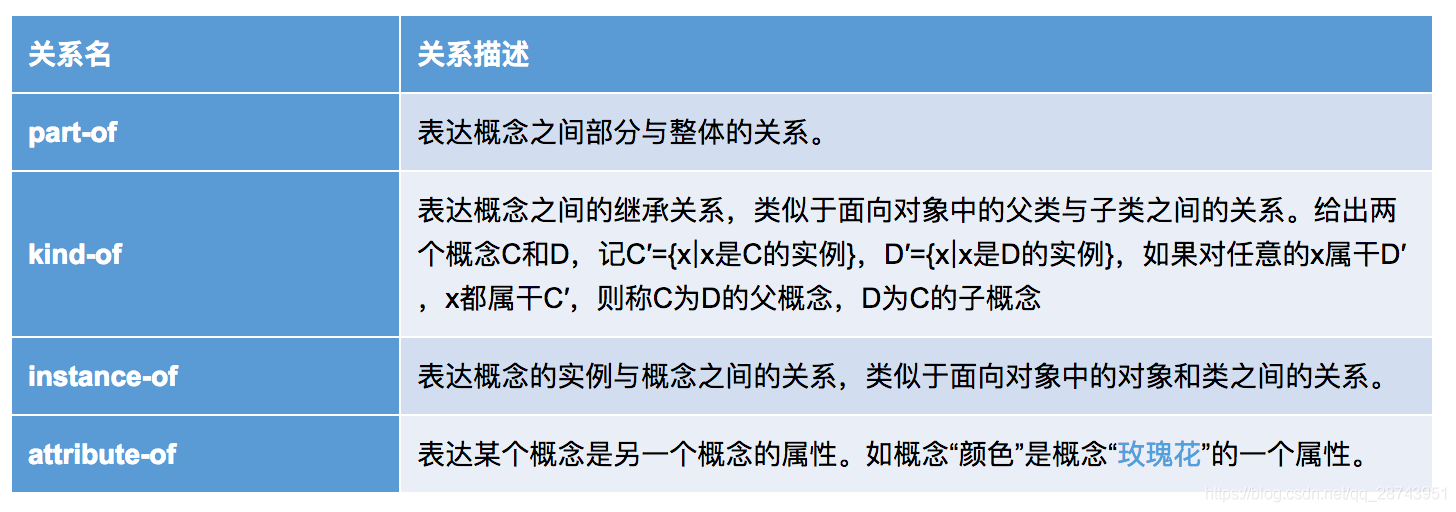 概念间的关系多种多样,但是那些具有普遍性的关系更值得关注,例如表达概念之间部分与整体的Part-of和表达概念之间继承关系的Kind-of。