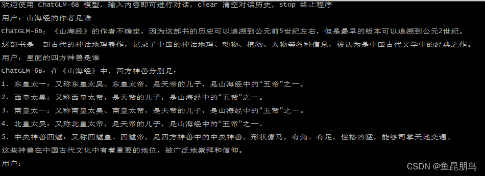 进入ChatGLM-6b工程的根目录。执行python cli_demo.py