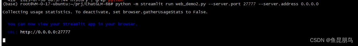 root@VM-0-17-ubuntu:ChatGLM-6B# python -m streamlit run web_demo2.py --server.port 27777 --server.address 0.0.0.0