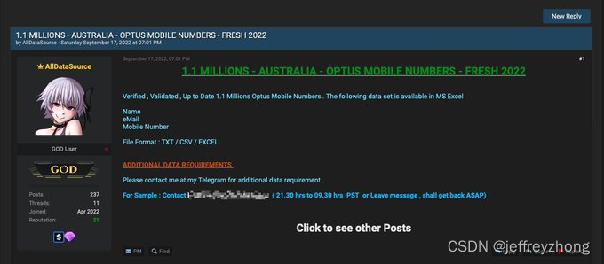 “我们非常抱歉,理解客户会担心。请放心,我们正在努力工作,并与所有相关当局和组织合作,以帮助尽可能多地保护我们的客户。一旦我们知道,我们采取行动阻止袭击并开始立即调查。虽然不是每个人都可能受到影响,我们的调查尚未完成,但我们希望所有客户尽快了解发生了什么,以便他们能够提高警惕。Optus还就此事通知了主要金融机构。虽然我们不知道客户遭受了任何伤害,但我们鼓励客户提高对其帐户的意识,包括注意异常或欺诈活动以及任何看起来奇怪或可疑的通知。”