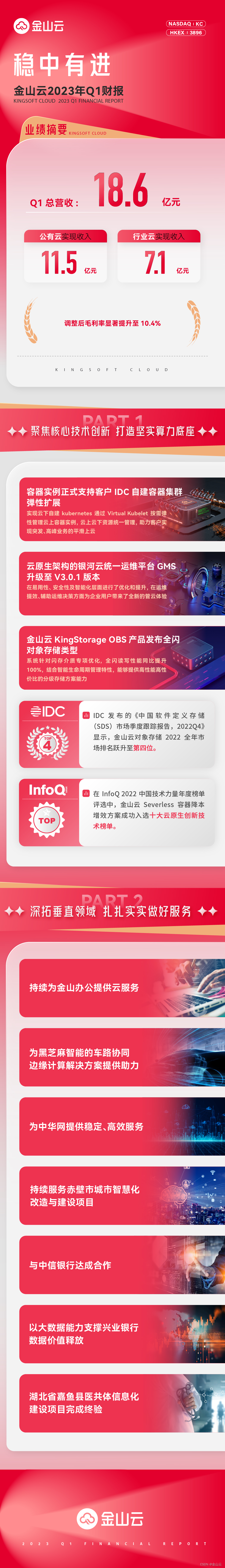 财报显示,金山云Q1营收18.6亿元,调整后毛利率达10.4%创历史新高,同比大幅提升171%,连续四个季度实现环比稳步提升;调整后毛利额创历史单季新高,同比上涨133%。一季度,公有云实现收入11.5亿元,毛利率达到2.1%,较2022年同期显著提升;行业云实现收入7.1亿元,毛利率为23.8%,较2022年同期大幅提升。