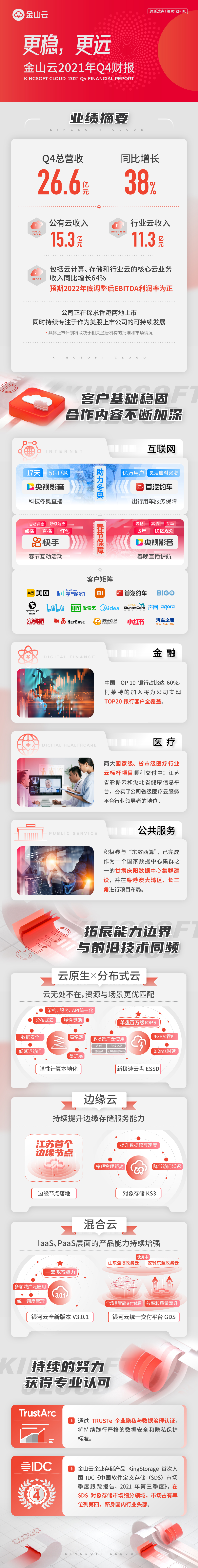 今天,金山云公布了2021年第四季度业绩,总营收26.6亿元,同比增长38%。