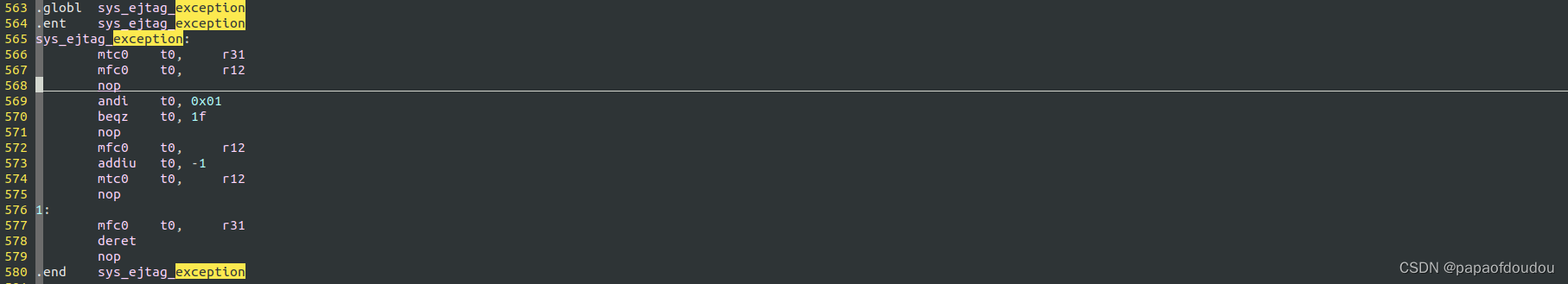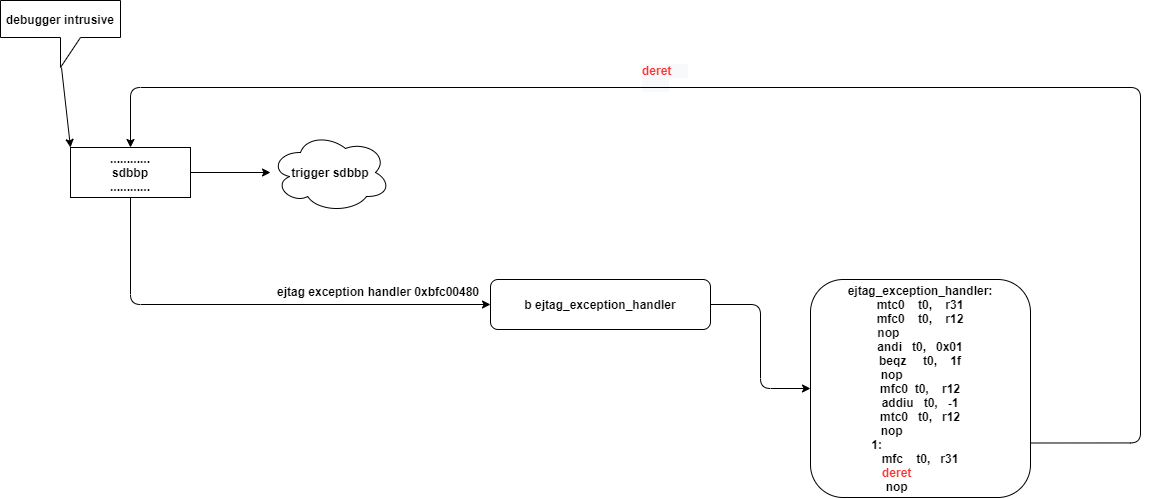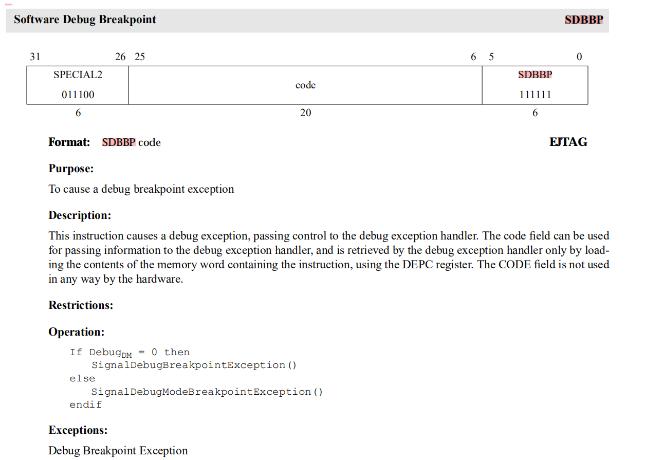 实现此功能需要用到MIPS的"SDBBP"指令,关于这条指令,MIPS官方ISA Spec有详细说明,整个过程可以这样理解,sdbbp之于裸机debugger,就相当于int3之于GDB,ICE仿真器就相当于Linux内核。