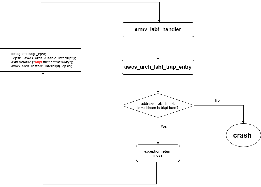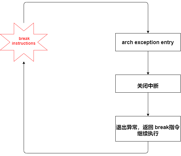 答案是肯定的,如下是架构无关的实现流程,通过beak指令触发异常,然后再异常中再次返回break指令,再次触发异常,再次返回。。。。。,通过这样一个指令序列,可以保证CPU循环执行break调试请求调试指令,这样,调试器再任何时刻侵入调试,都可以使CPU进入调试状态: