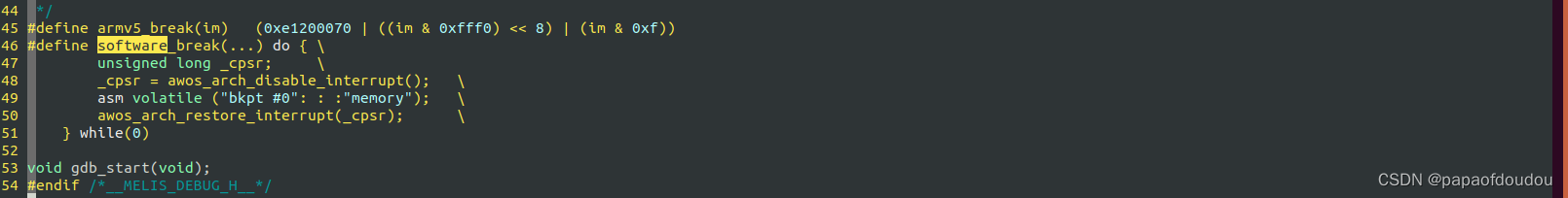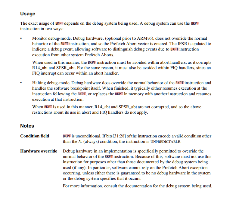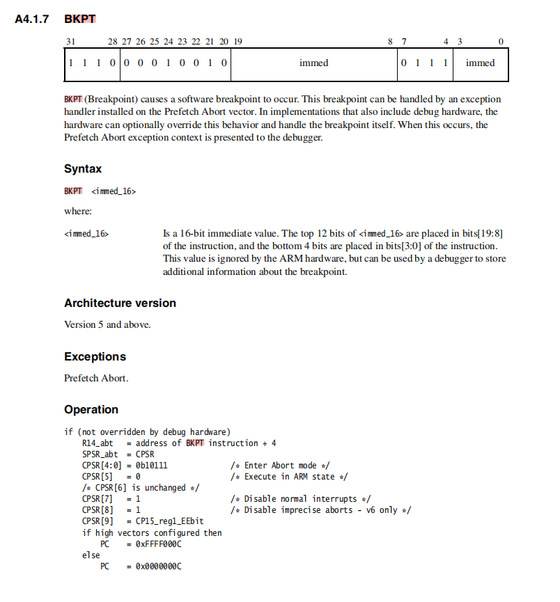 arm实现使用的是bkpt指令,关于bkpt 指令,arm ISA 文档花了两页进行介绍