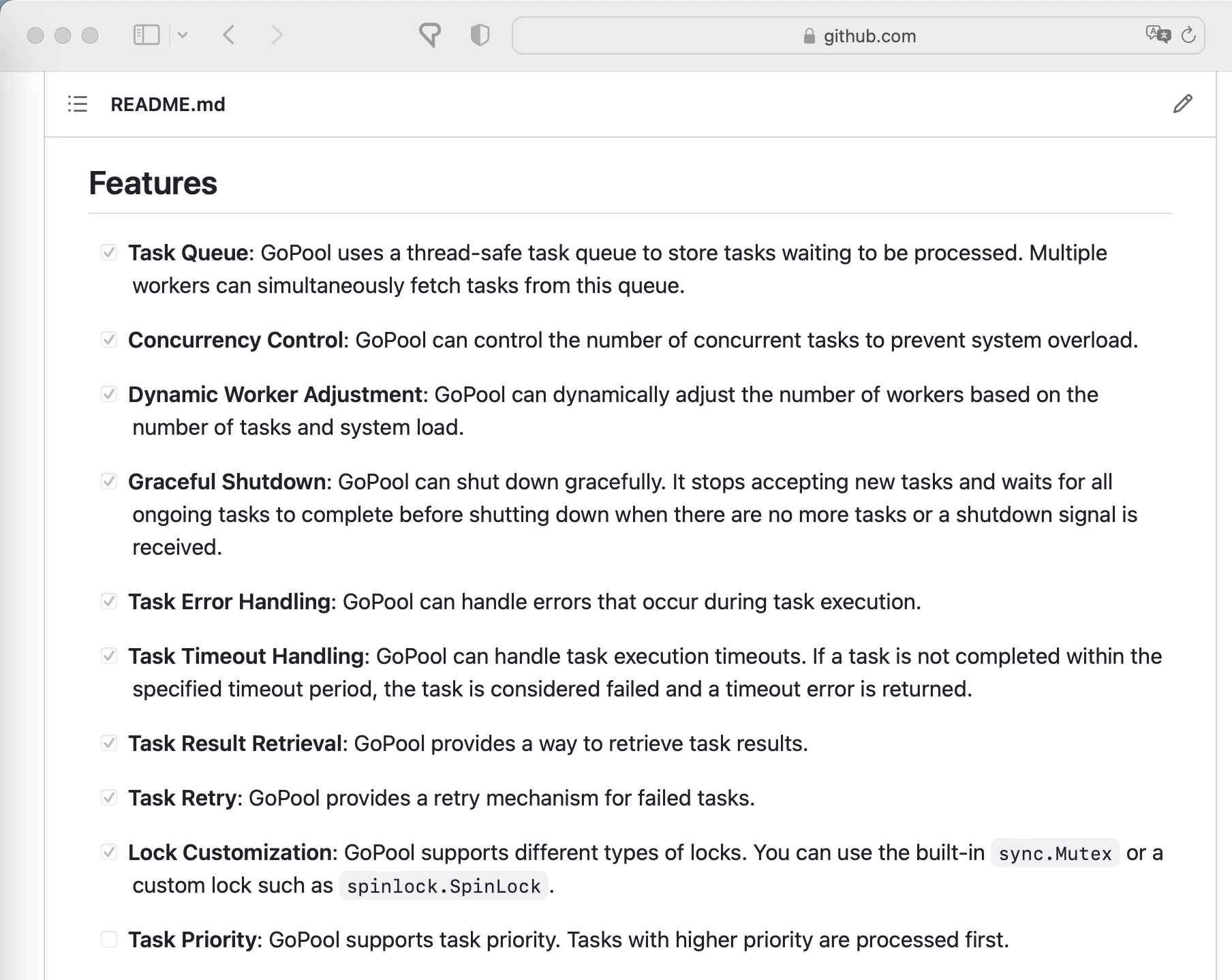 )func main() {pool := gopool.NewGoPool(100, gopool.WithErrorCallback(func(err error) {fmt.Println("Task error:", err)}))defer pool.Release()for i := 0; i < 1000; i++ {pool.AddTask(func() (interface{}, error) {return nil, errors.New("task error")})}pool.Wait()