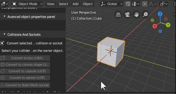 - 打开“碰撞和套接字”面板,然后单击相应的按钮以将选择内容转换为对撞机或套接字(已转换的对撞机为绿色,现在是该资产的子代)。