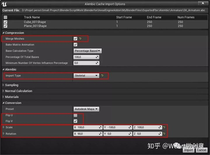- 对于Alembic动画资产,请勾选“合并网格”。对于Alembic动画资产,合并网格