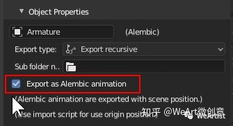 - 不要忘记选中要导出的资产类型中的Alembic动画框。确保动画至少播放一次以进行烘焙缓存。您还可以使用命令“ bpy.ops.ptcache.bake_all()”来烘焙物理。