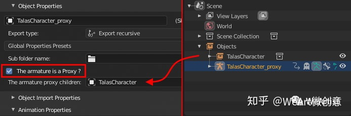 如果要使用代理导出骨骼网格物体的动画,则应在代理上设置“导出递归”。勾选“The armature is a Proxy” 并选择子代理。