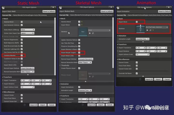 - 对于骨骼网格物体资产,如果您使用形状关键点,则需要勾选导入变形目标。对于骨骼网格物体,您需要插入转换变形目标,如果您使用形状键