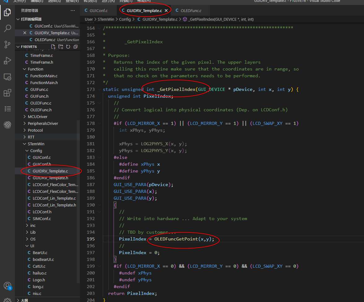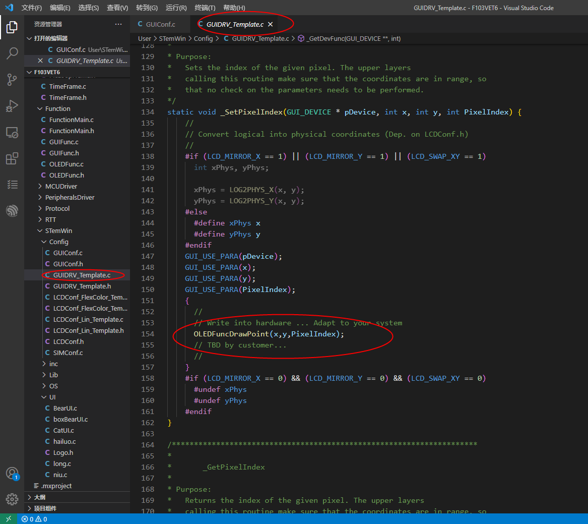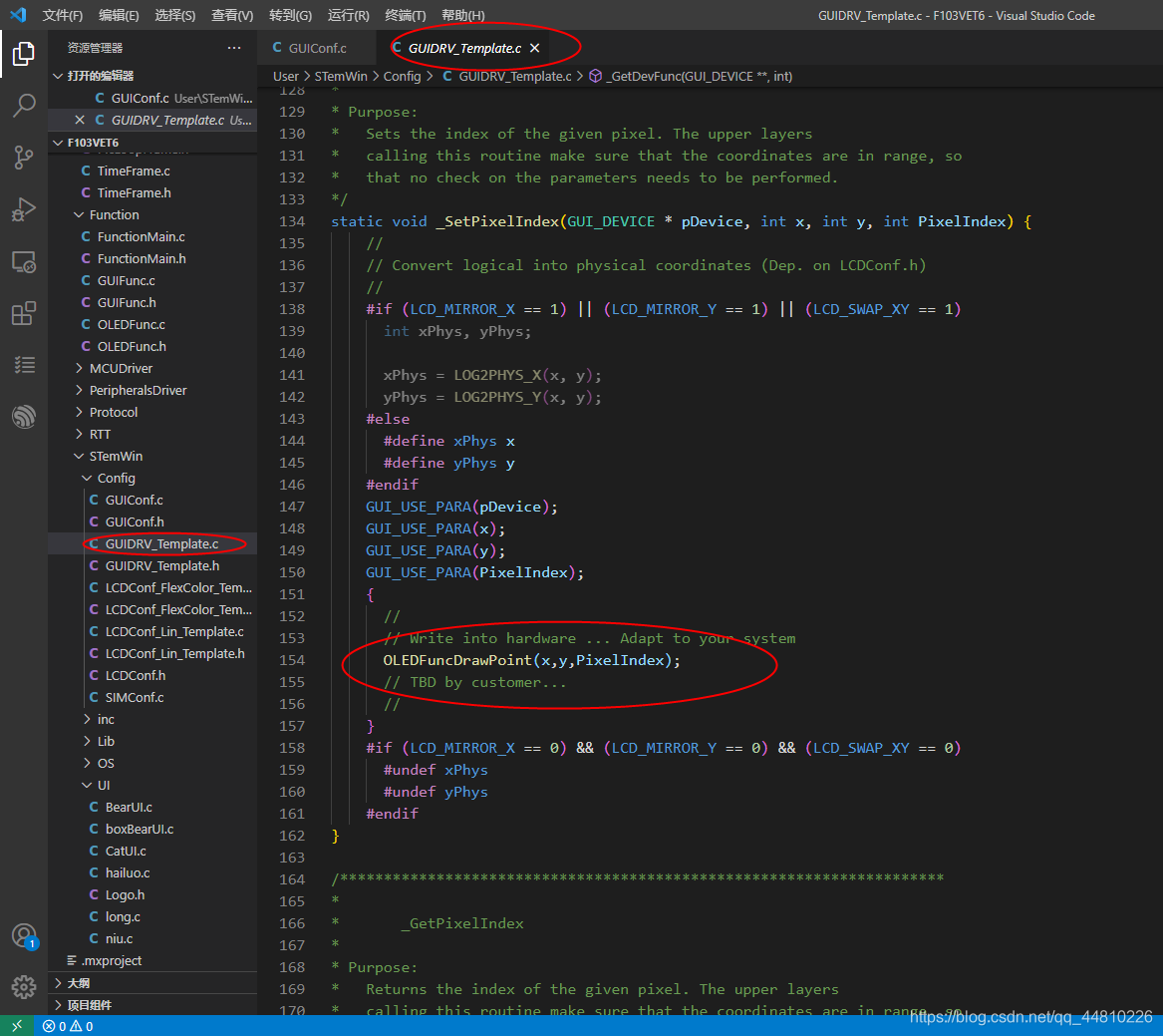 【GUIDRV_Template.h】:对接屏幕硬件,GUI驱动,这里只将基础的画点以及读点的函数对接进去。还有其他的函数也可以对接。