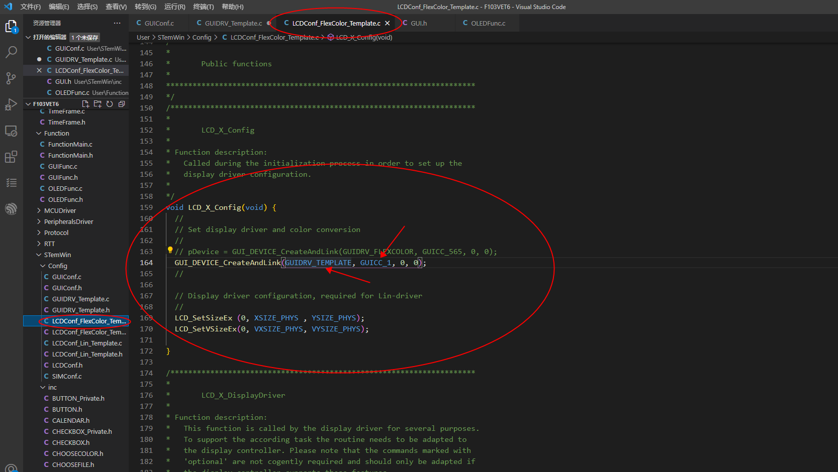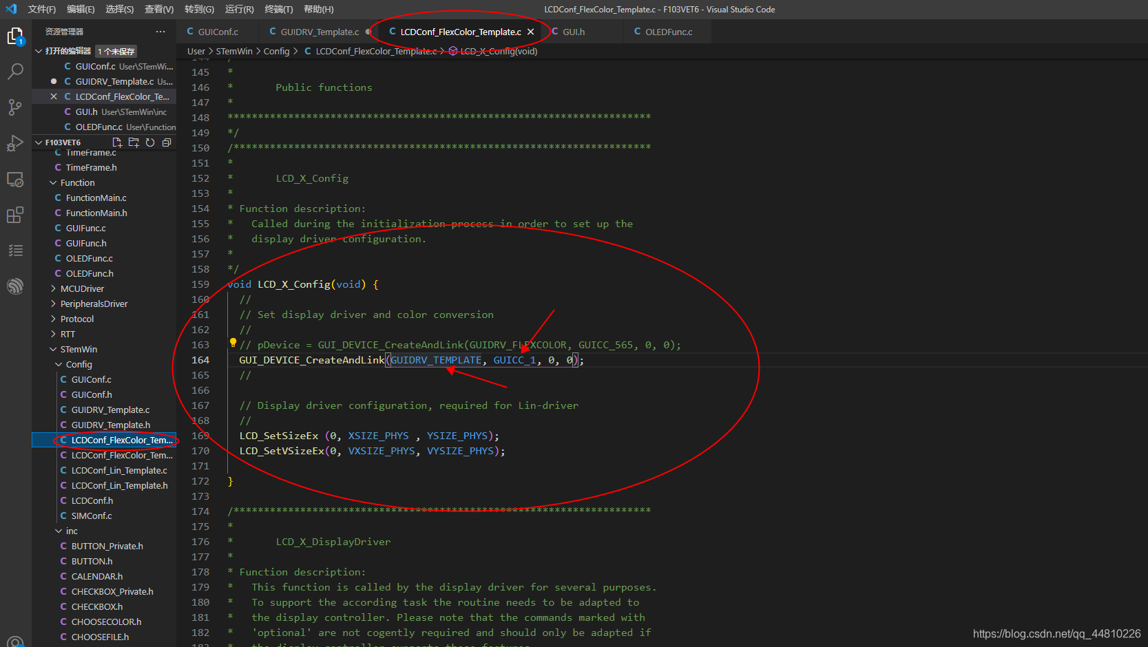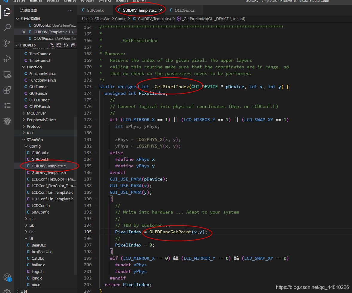 【GUIDRV_Template.h】:对接屏幕硬件,GUI驱动,这里只将基础的画点以及读点的函数对接进去。还有其他的函数也可以对接。