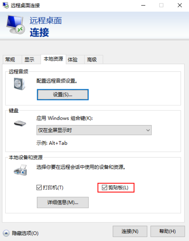 5. (可选)如需在远程会话中使用本地主机的资源,请单击“本地资源”选项卡完成如下配置。