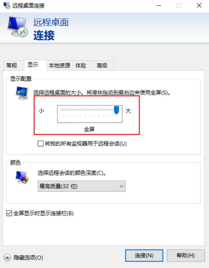 6. (可选)如需调整远程桌面窗口的大小,可以选择“显示”选项卡,再调整窗口大小。