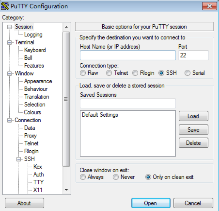 d. Saved Sessions:任务名称,在下一次使用putty时就可以单击保存的任务名称,即可打开远程连接。