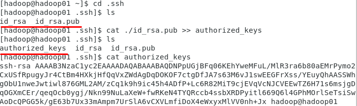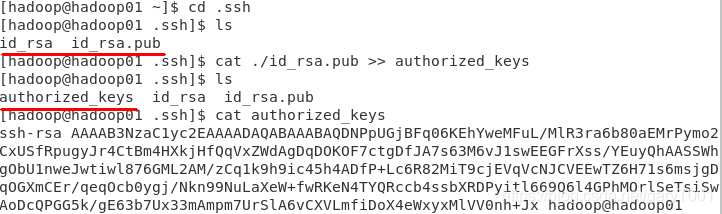 在/home/hadoop/.ssh路径下,已经生成了公私钥对,分别为id_rsa(私钥)、id_rsa.pub(公钥);