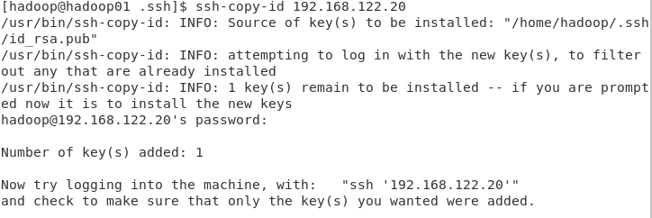执行"ssh-copy-id"命令,后面的ip是hadoop2的地址,同理,传递给hadoop3就换成对应的地址,以此类推;