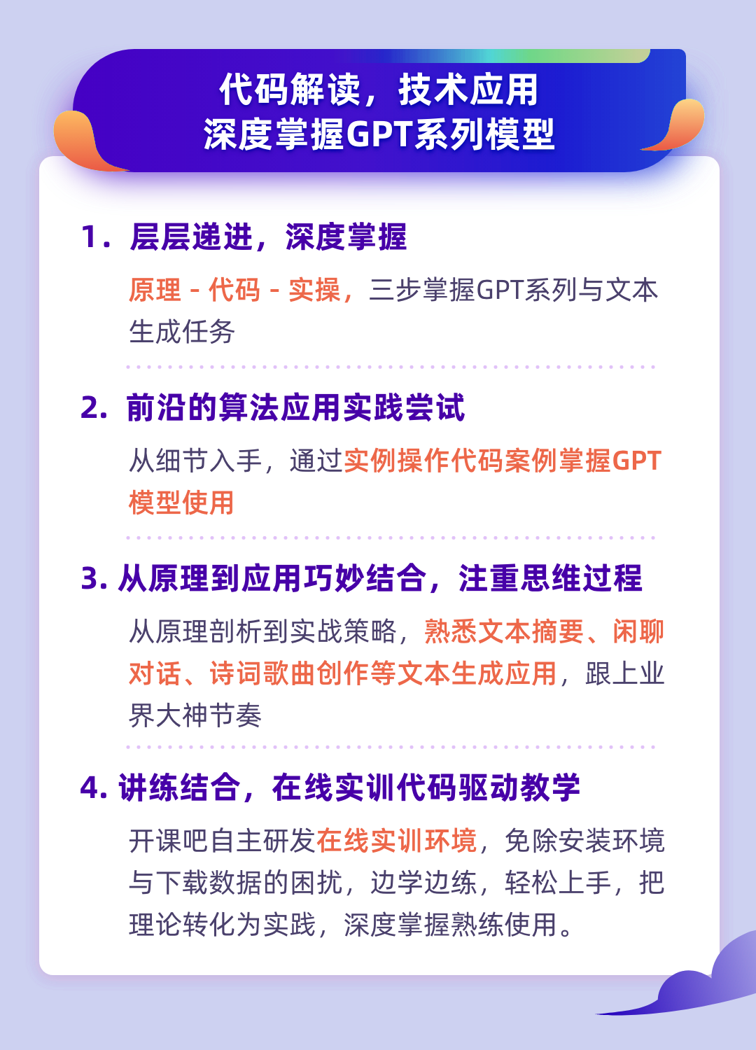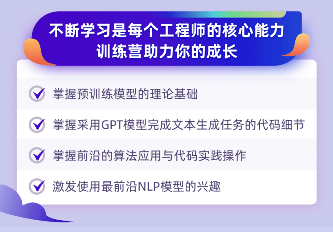 本次训练营,老师将从理论解读到代码实践,聚焦GPT系列模型。不断学习是每一个工程师的核心能力,训练营助力你的成长。