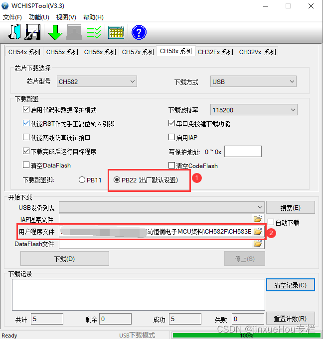 步骤二:CH573F评估板上什么都不接,把电源开关打开,把PB11接VCC(3.3V)也可以不接VCC,GPIO引脚默认是3.0V,把PB22引脚接GND,然后数据线一端接到电脑上,把USB-A接到CH573F开发板上,接上去的时刻,看一下WCHISPToolV3.3软件上面的"USB设备列表"就会扫描和识别到USB接口,赶紧点击“下载”按钮对程序进行烧录。