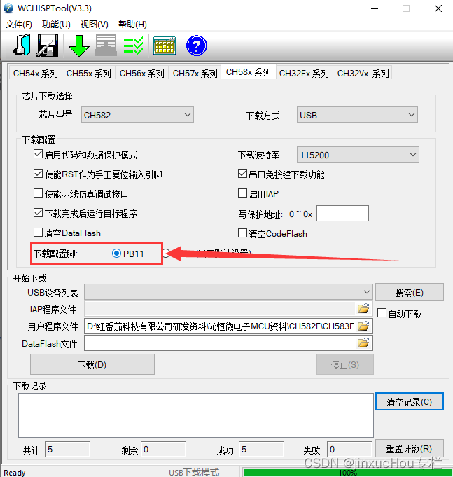 CH573F用WCHISPToolV3.3软件配置PB11烧录程序后无法识别到USB的解决办法