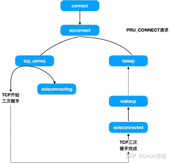上图说明connect如何处理面向连接的协议,如TCP。在这种情况下,协议层开始建立连接,调用soisconnecting指示连接将在某个时刻完成。如果socket是非阻塞的,soconnect调用等待连接完成。对于TCP,当三次握手完成时,协议层调用soisconnected将socket标识为已连接,然后调用wakeup唤醒等待的进程,从而完成connect系统调用。