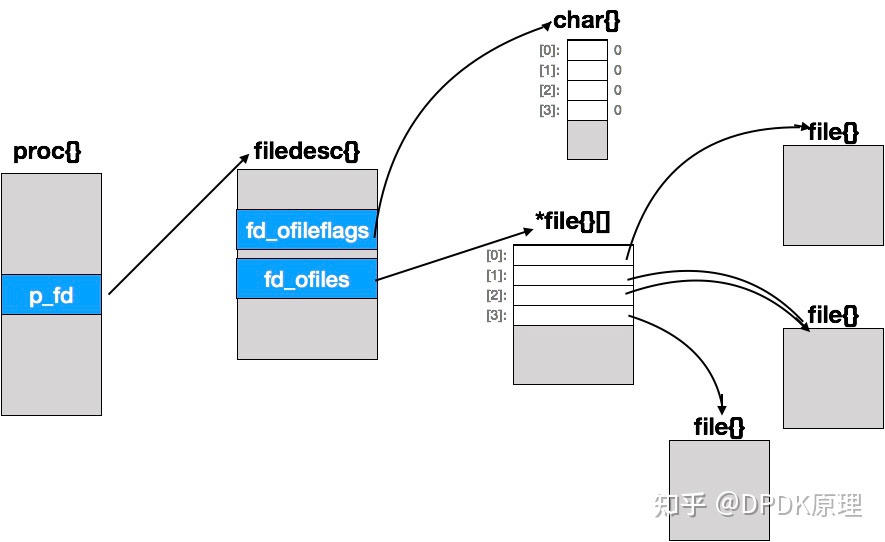 实现系统调用的函数的第一个参数总为p,即指向调用进程的proc结构的指针。内核利用proc结构体记录进程的有关信息。在proc结构体中,p_fd指向filedesc结构,该结构的主要功能是管理fd_ofiles指向的描述符表。描述符表的大小是动态变化的,由一个指向file结构的指针数组组成。每一个file结构体描述一个打开的文件,该结构体可被多个进程共享。