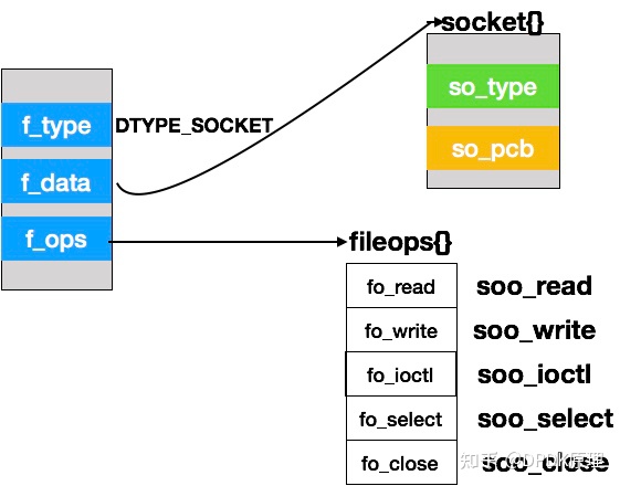 通过p->p_fd->fd_ofiles[fd]访问到结构。在file结构中,有两个结构成员是我们感兴趣的:f_ops和f_data。I/O系统调用(如read和write)的实现因描述符中的I/O对象类型的不同而不同。f_ops指向fileops结构,该结构包含一张read、write、ioctl、select和close系统调用的函数指针表。显示f_ops指向一个全局的fileops结构,即socketops,该结构包含指向socket用的函数的指针。