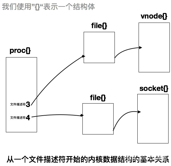 一个文件描述符是进程对应的进程表项中的一个数组的下标.这个数组项是一个指向打开文件表结构的指针。