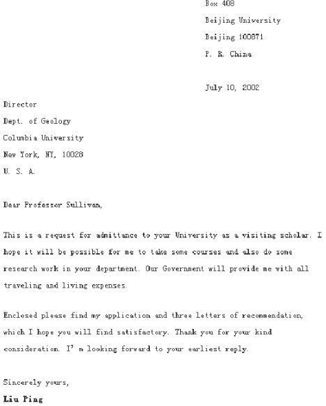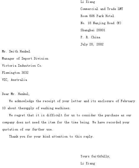 | 写信人姓名 (熟人,信头地址信息可以忽略) 写信人地址 写信日期 收信人地址 收信人称呼(Dear:) (主题部分,有两种形式, 一是齐头,适用于商业,正式文件等,即每行不缩进,全部顶左边书写,信尾客套话和签名也靠左边书写 二是折衷式,适用于熟人朋友之间写信,我们传统的头行缩进方式,信尾客套话和签名在后下角) 结尾客套话Yours sincerely(认识的人),yours faithfully(不认识的人)