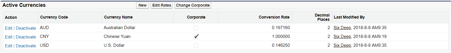 2. 我们计划通过切换User上的Currency字段,来观察记录在用户界面,SOQL及报表里面的影响: