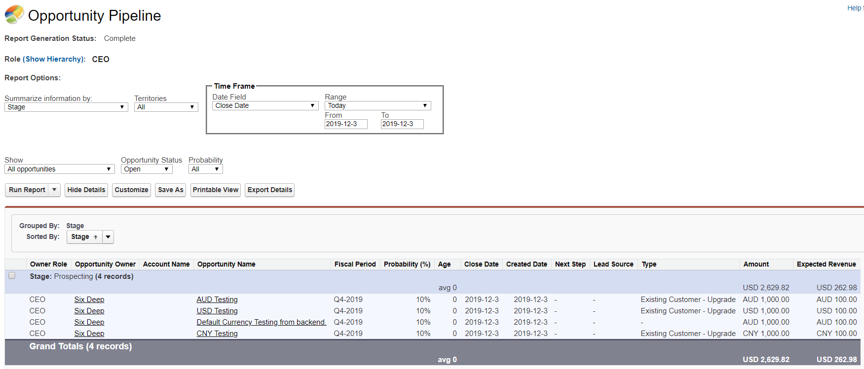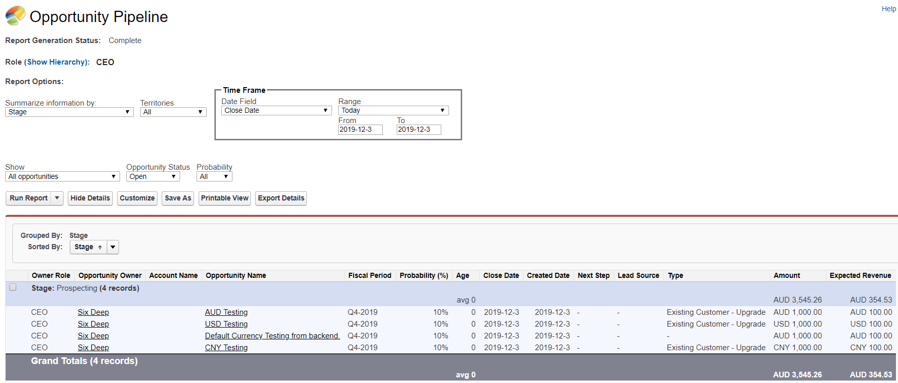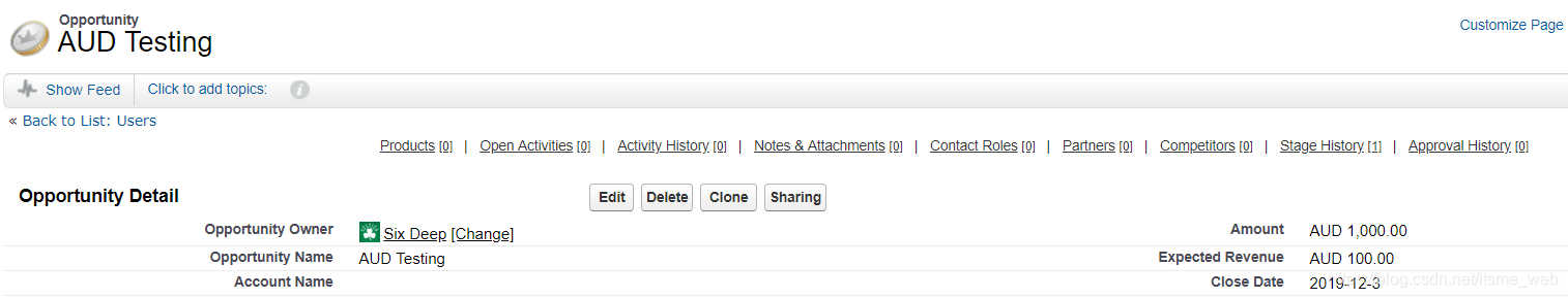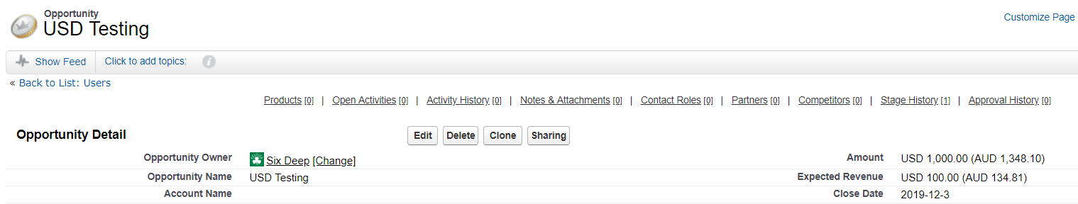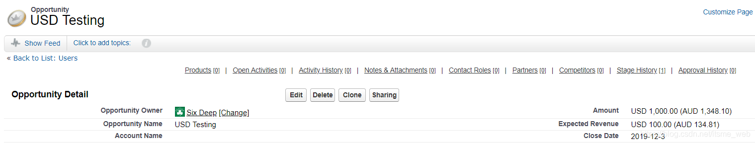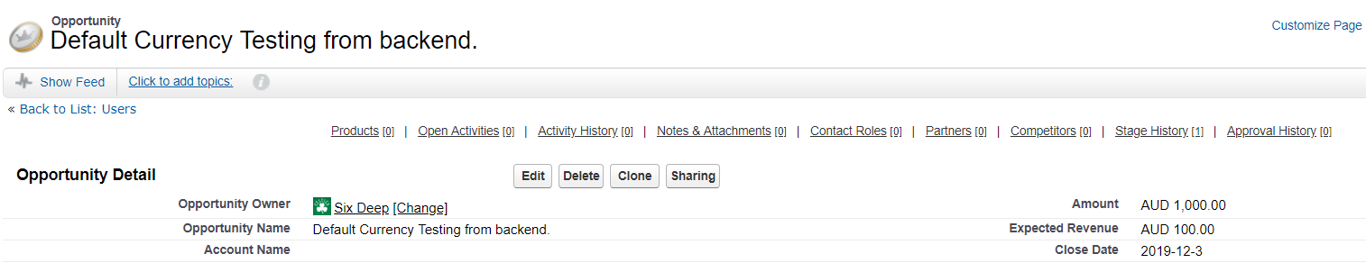 假如User的Currency为AUD,当创建Opponenty时,Opportunity Currency会被赋默认值AUD,最终展示如下: