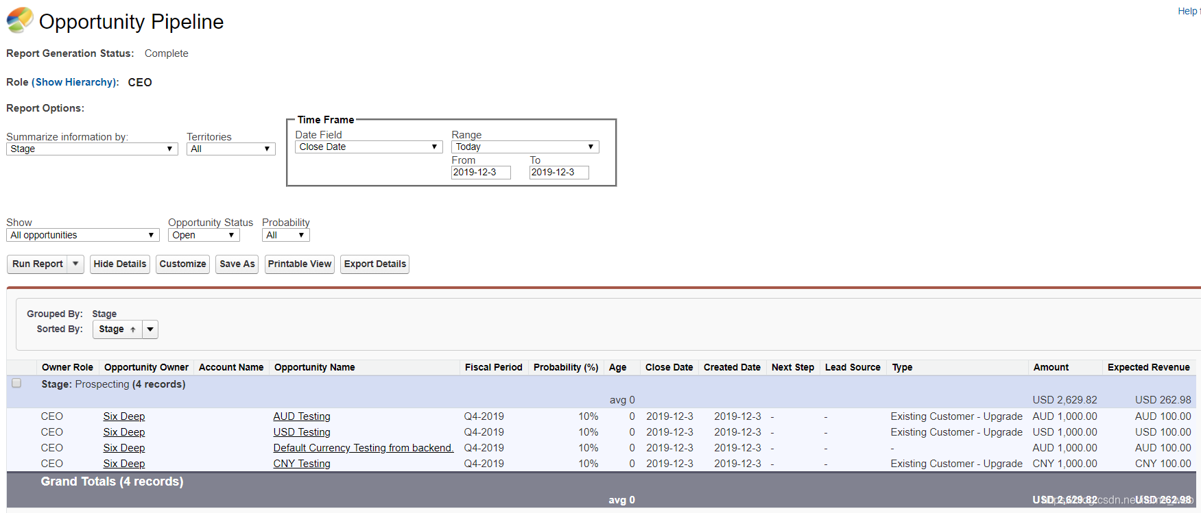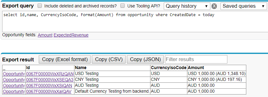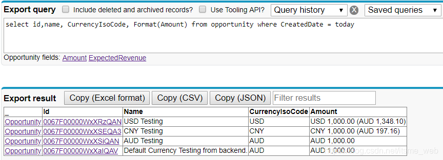 3. 界面和SOQL format显示的结果相同,User和单子配置一致,则显示单种货币类型,不一致则有限显示单子类型,用户类型紧随其后;报表显示更加精炼,单项显示单子货币类型及输入值,汇总显示User货币类型及汇率转化后的实际值;