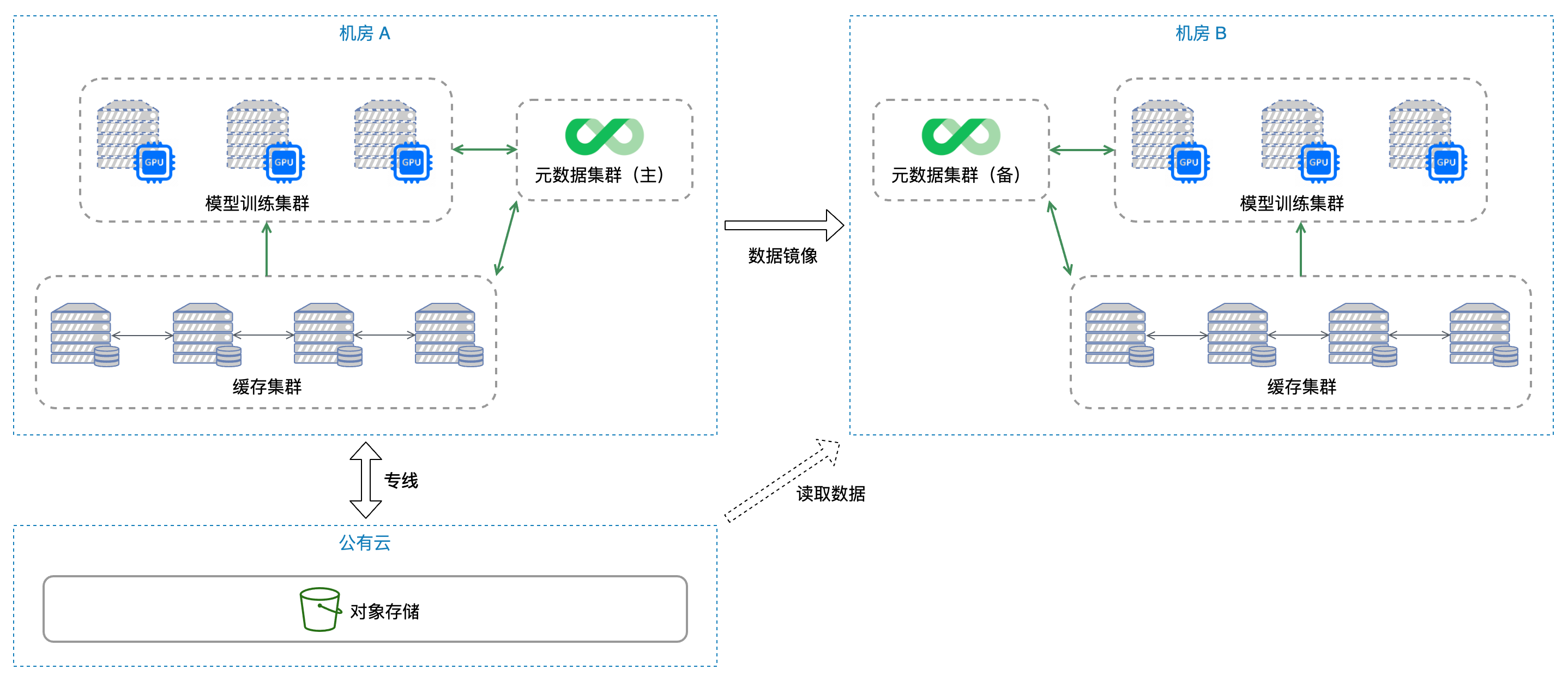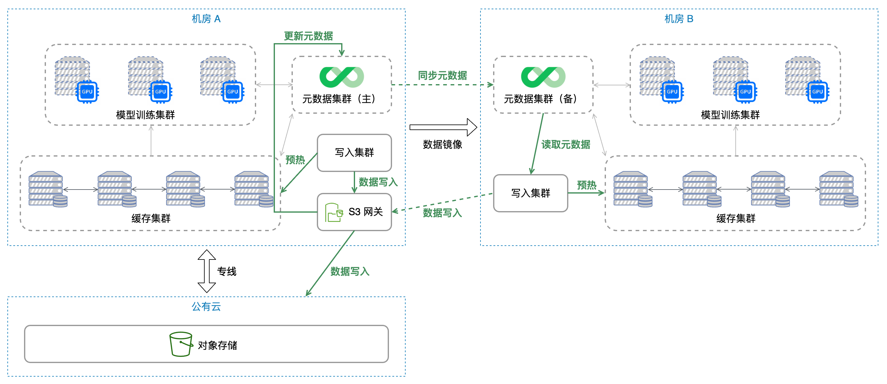启用数据镜像后,所有数据可以自动复制到两个对象存储中,起到异地灾备的作用。如果不需要异地灾备,在镜像区域可以不配置对象存储,只进行元数据的复制,数据可以提前预热到镜像区域的独立缓存集群来加速训练。这样可以省去一份对象存储的成本,本案例中的客户就采用了此方案。