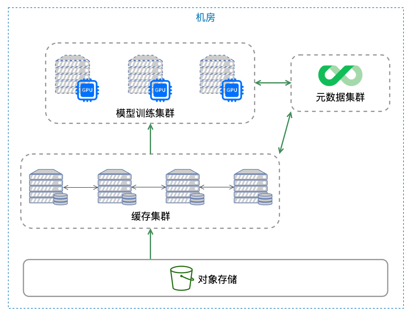 JuiceFS 非常适合这种 IDC 机房 + 公有云的混合云架构。用户将自己的 IDC 机房与公有云专线连接,数据通过 JuiceFS 持久化到公有云对象存储中,在 IDC 机房里设置一个缓存集群,起到缓存数据加速训练的效果,相比每次从对象存储访问数据,既能节省专线带宽,还能节省对象存储 API 调用费用。
